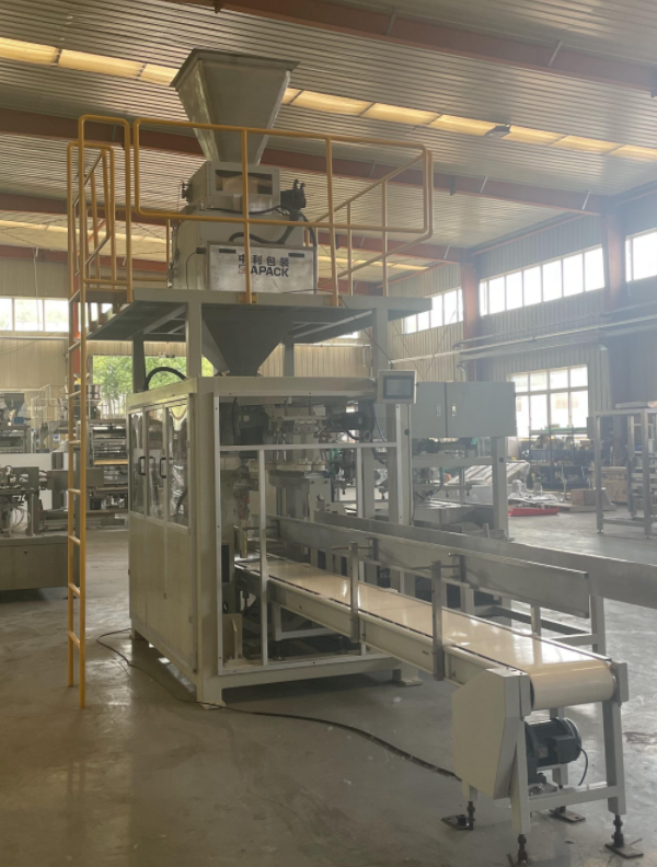 Hele linjen inklusive et sæt ZL25K-A model Fuldautomatisk pakkemaskine, et sæt ZL25K-S Dobbelt skovl servomotor vejemaskine (inklusive et sæt platform og stige, og færdigt produkt output transportbånd).