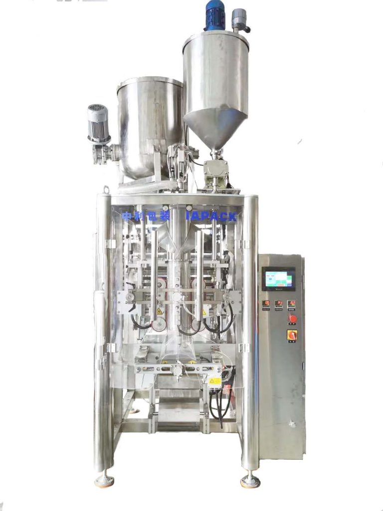 Denne enhed er udviklet til behovene for flydende og viskøse produkter. Enheden er sammensat af en fugemaskine og en pakkemaskine; emballeringsmaskinen har en enkel struktur og er nem at betjene; maskinen integrerer funktionerne posefremstilling, påfyldning, forsegling og optælling. Den bruger en servomotor til at trække filmen og har en automatisk afvigelseskorrektionsfunktion.